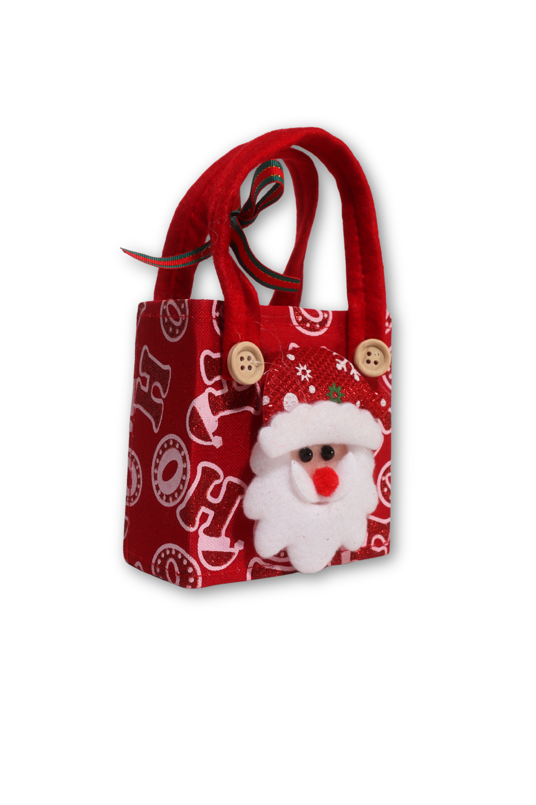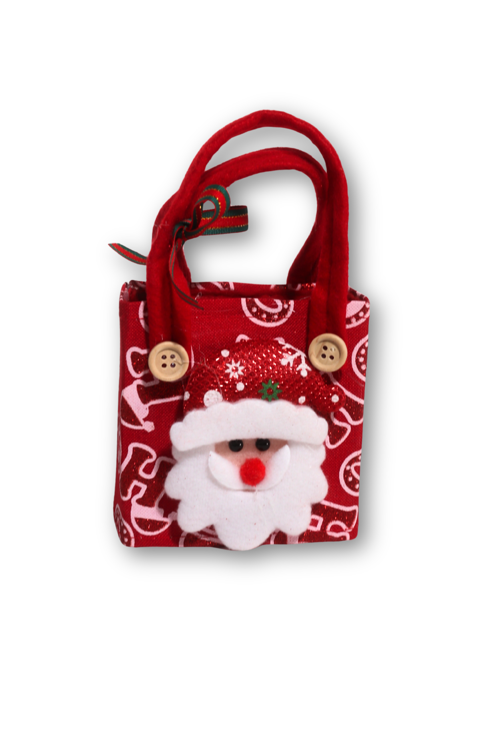 Această gentuță decorativă de Crăciun este perfectă pentru a adăuga un plus de farmec sărbătorilor. Fabricată din material textil roșu de bună calitate, are imprimeuri festive și o aplicație 3D din fetru reprezentându-l pe Moș Crăciun, cu detalii precum fes sclipitor, barbă pufoasă și nas roșu.