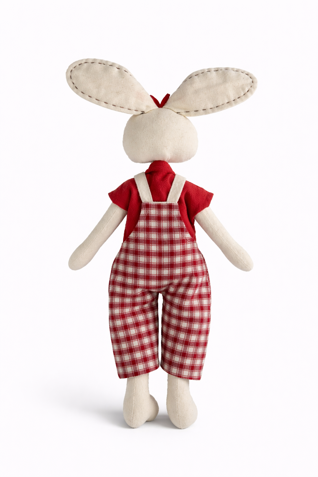 Ținuta formată din tricou roșu, salopetă în carouri și fundiță asortată oferă un design vesel și jucăuș, potrivit pentru joacă zilnică. Materialele textile sunt moi și plăcute la atingere, iar construcția atent realizată permite copilului să o manevreze ușor. Fiecare jucărie este realizată manual, fiind unică.