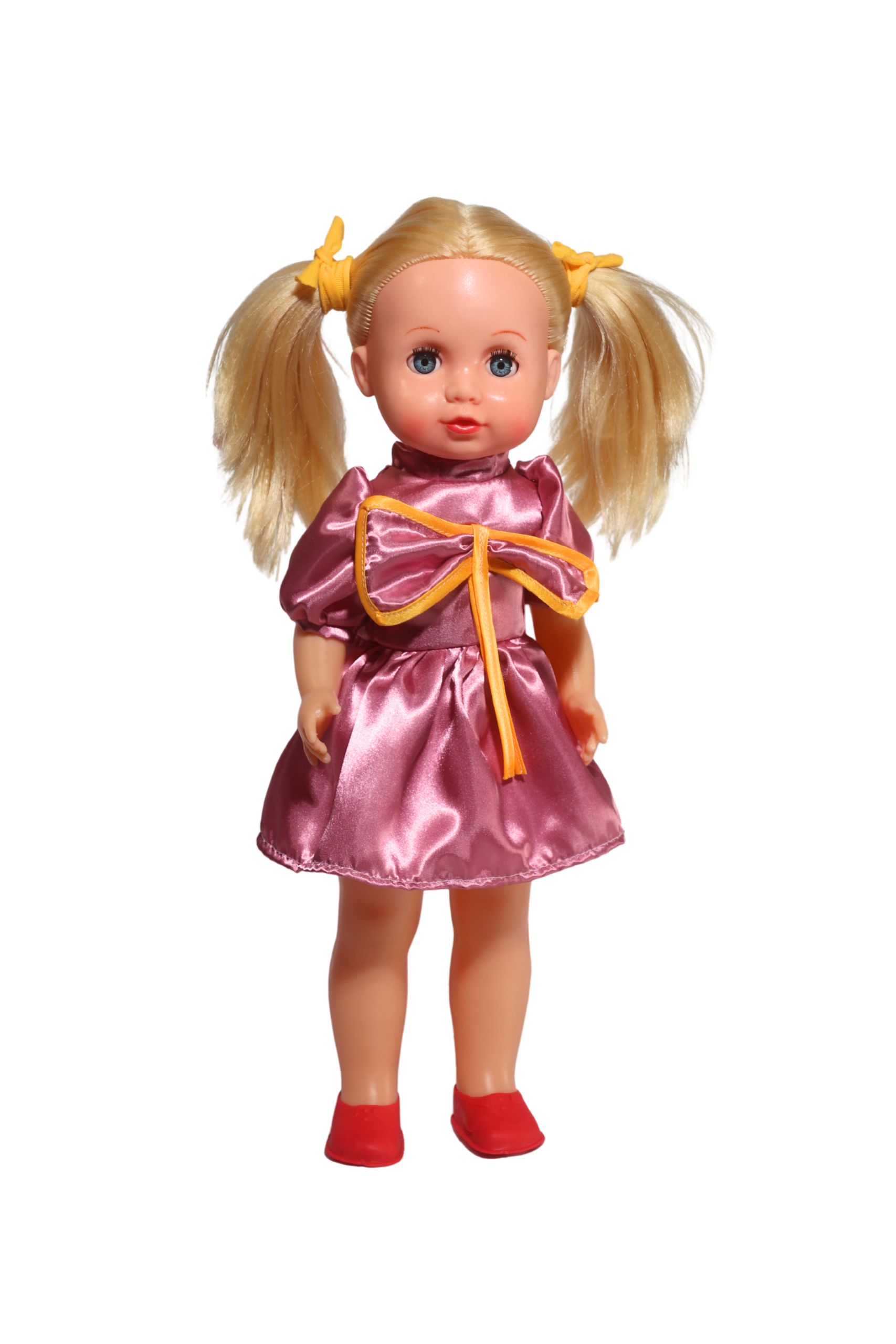 Păpușa Arădeanca blondă 45 cm este o jucărie clasică românească, cunoscută pentru durabilitate și aspectul tradițional. Are păr blond lung, prins în două cozi cu elastice galbene, ușor de aranjat și pieptănat. Trăsăturile feței sunt fine și expresive, specifice păpușilor Arădeanca.