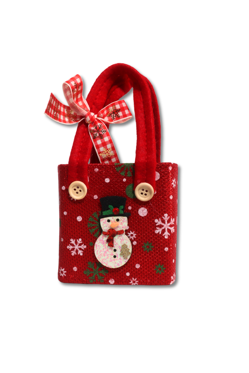 Punguță decorativă de Crăciun, realizată din material textil roșu, cu mâner din fetru și aplicație Om de Zăpadă. Ideală pentru cadouri mici, dulciuri sau decor.