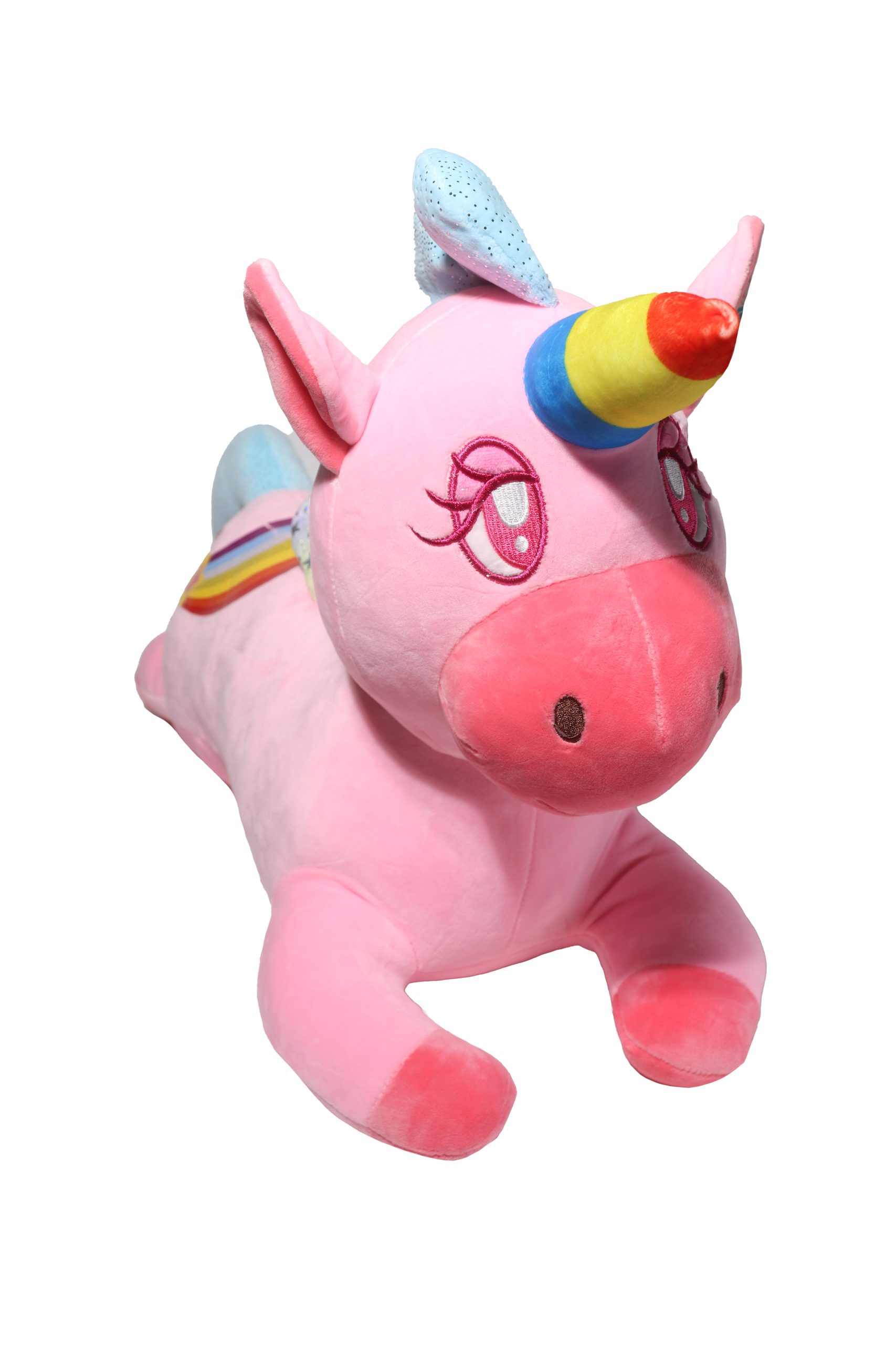 Unicorn de pluș XXL, moale și colorat, cu aripi strălucitoare și corn multicolor. Perfect pentru îmbrățișări, decor și cadouri pentru copii. Disponibil pe roz sau turcoaz.